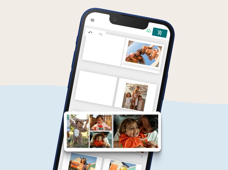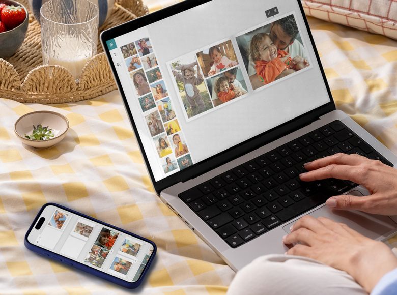 Ponte directamente a diseñar. Sube unas cuantas fotos o un álbum entero y nuestra herramienta las organizará en un bonito diseño, listo para que lo personalices a tu gusto.