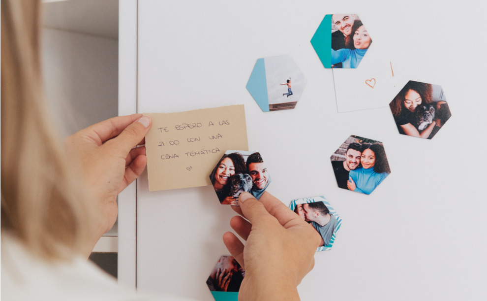 Se levanta de la cama, se lava la cara y va a la cocina a hacerse un café, abre la nevera para coger la leche y… ¡sorpresa! Se encuentra un mural de 9 Imanes Personalizados con vuestras mejores fotos y unas entradas sujetadas en ellos.