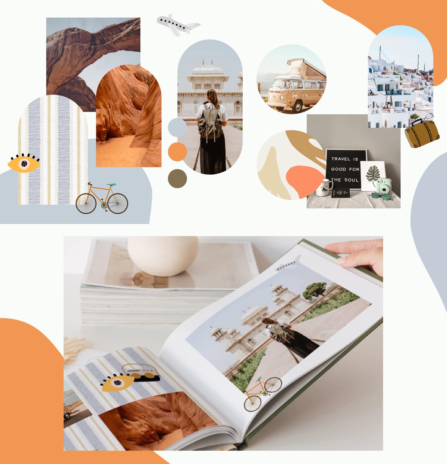 Si eres de esas personas que tienen la galería de su móvil llena de fotos de escapadas y viajes 🌎 inspírate y descubre cómo puedes combinar los fondos, stickers y colores de nuestro editor para crear un Libro de Fotos Apaisado que deje con la boca abierta a todo aquel al que se lo enseñes.